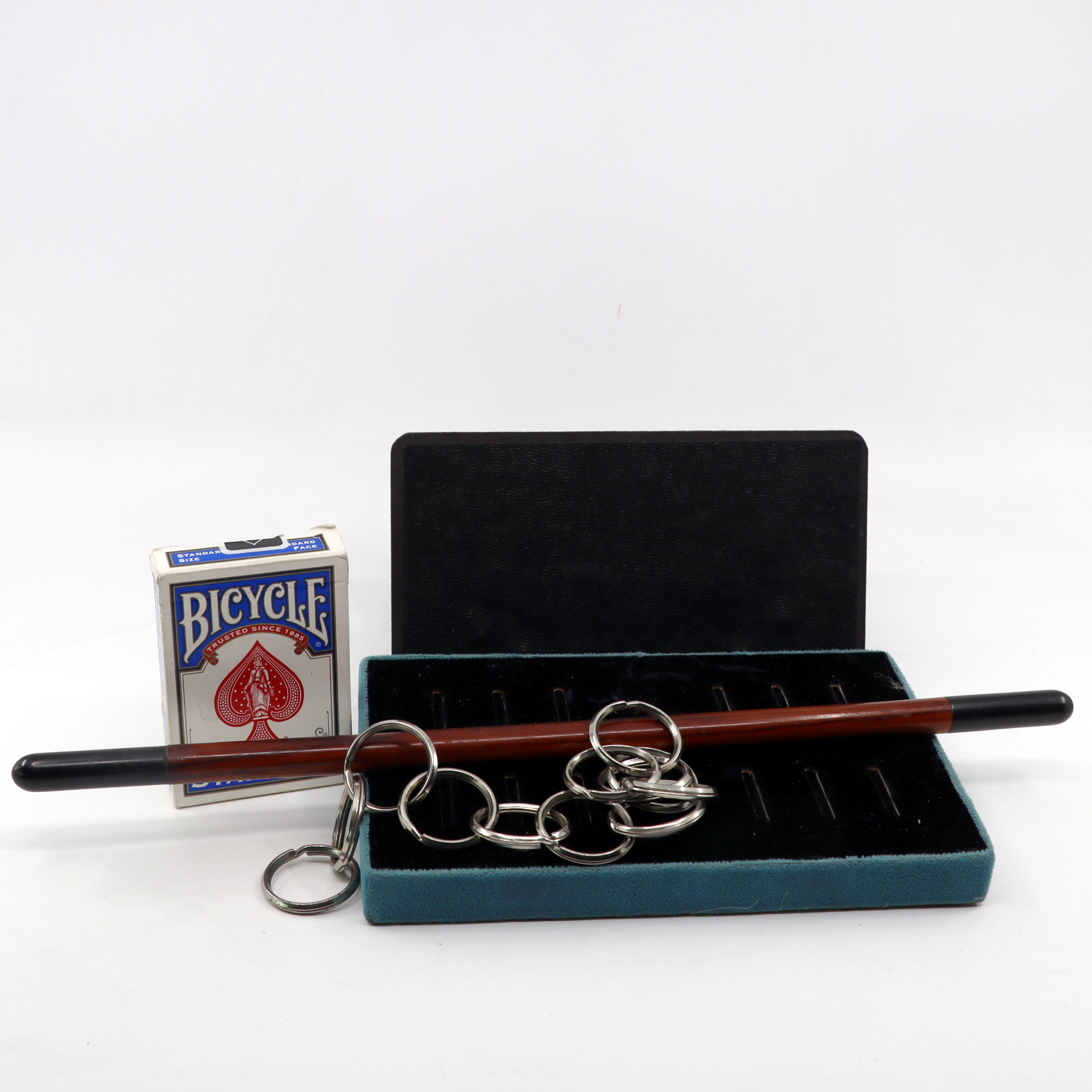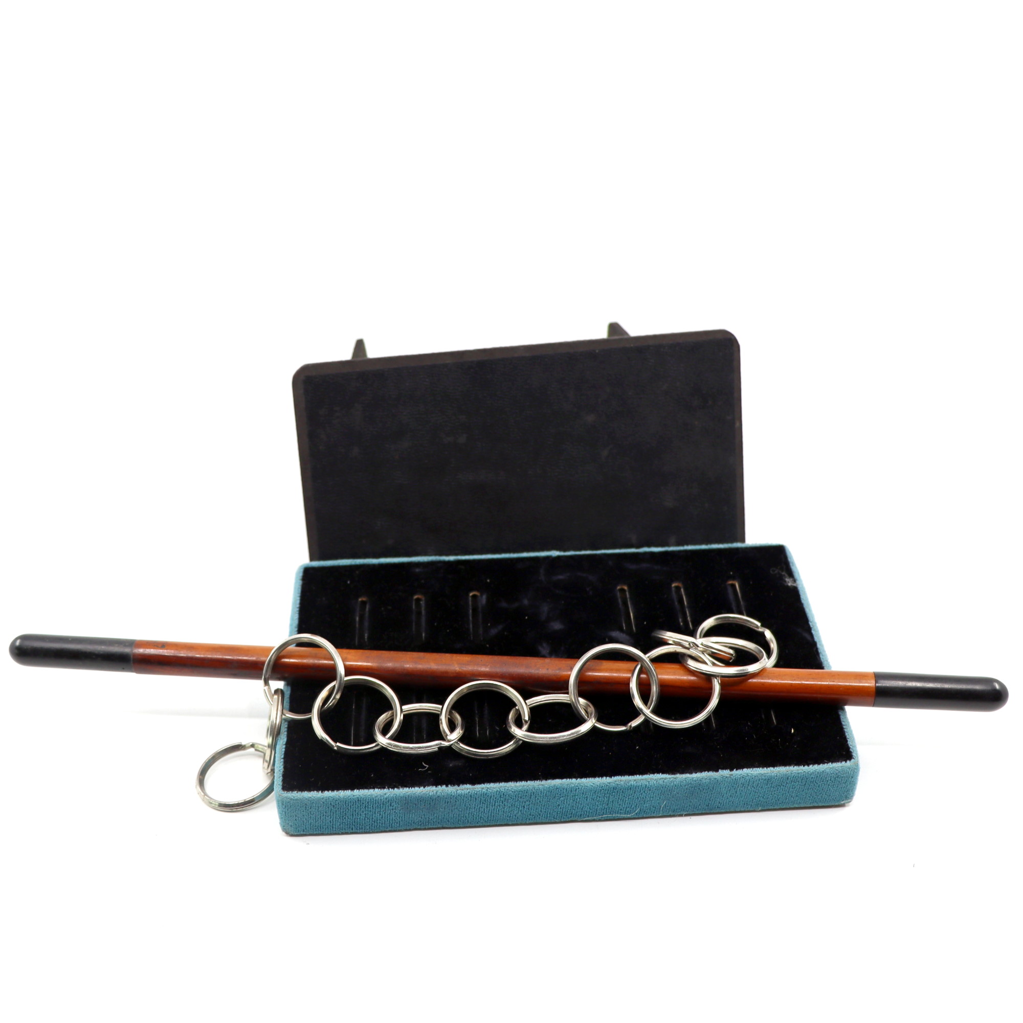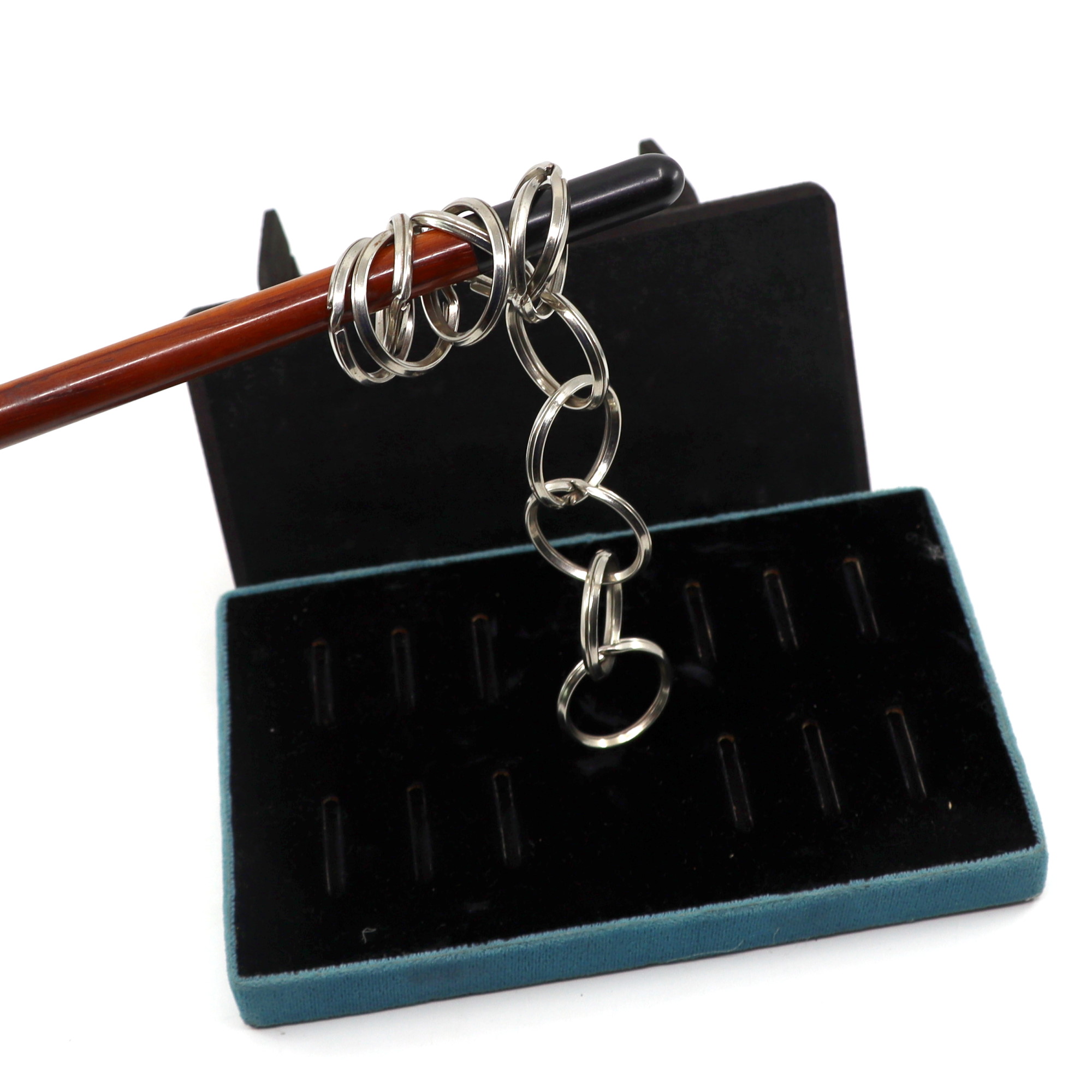 The magician removes twelve sparkling one inch key rings from o gorgeous velvet display case. These are picked up one at a time and dropped on a wand. Sliding the rings off into his hand the rings slowly emerge linked in ONE SOLID CHAIN and both hands shown empty.