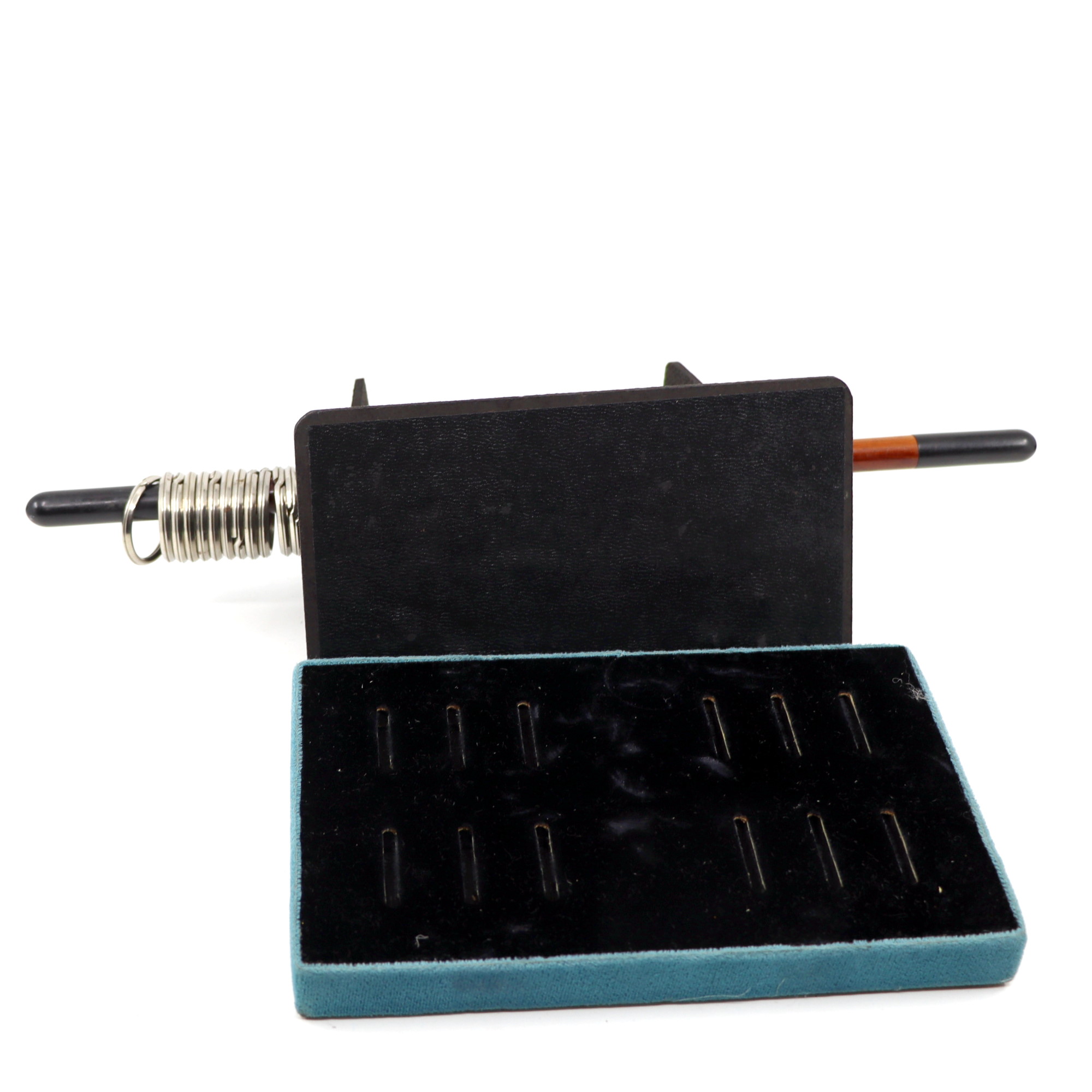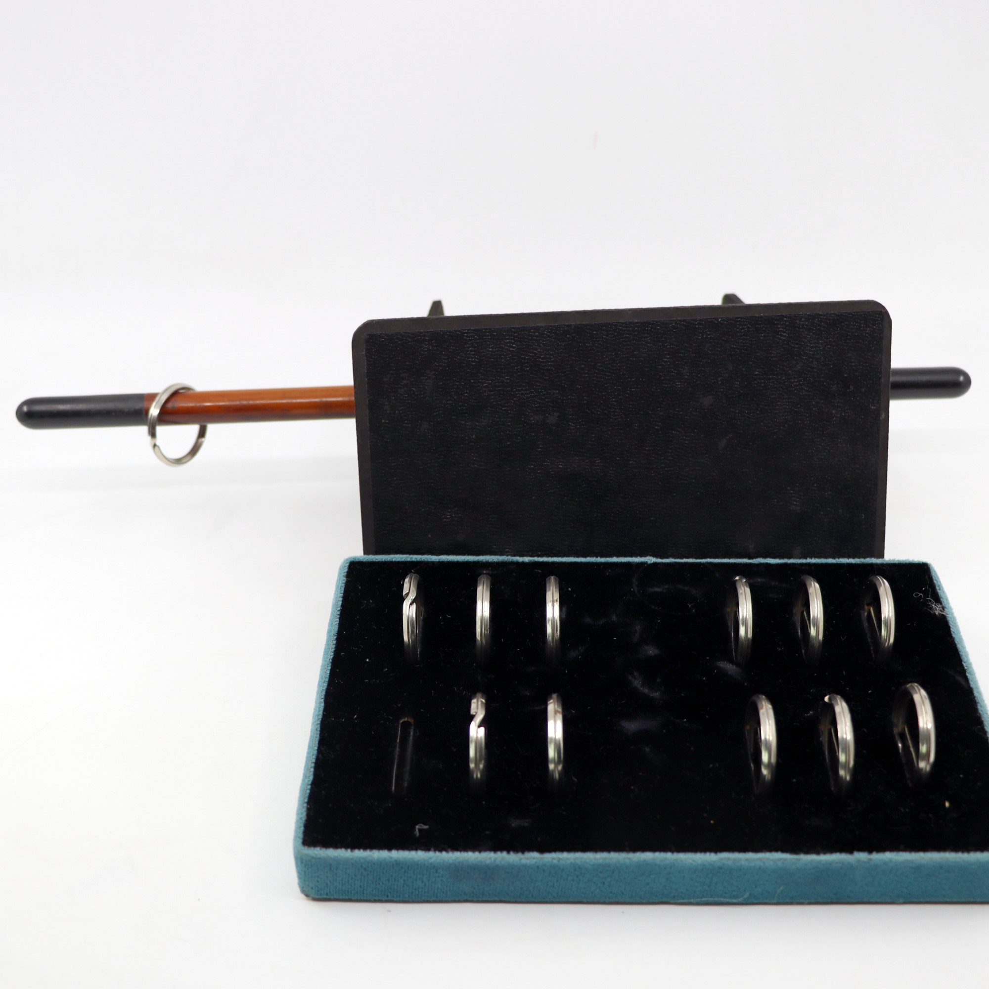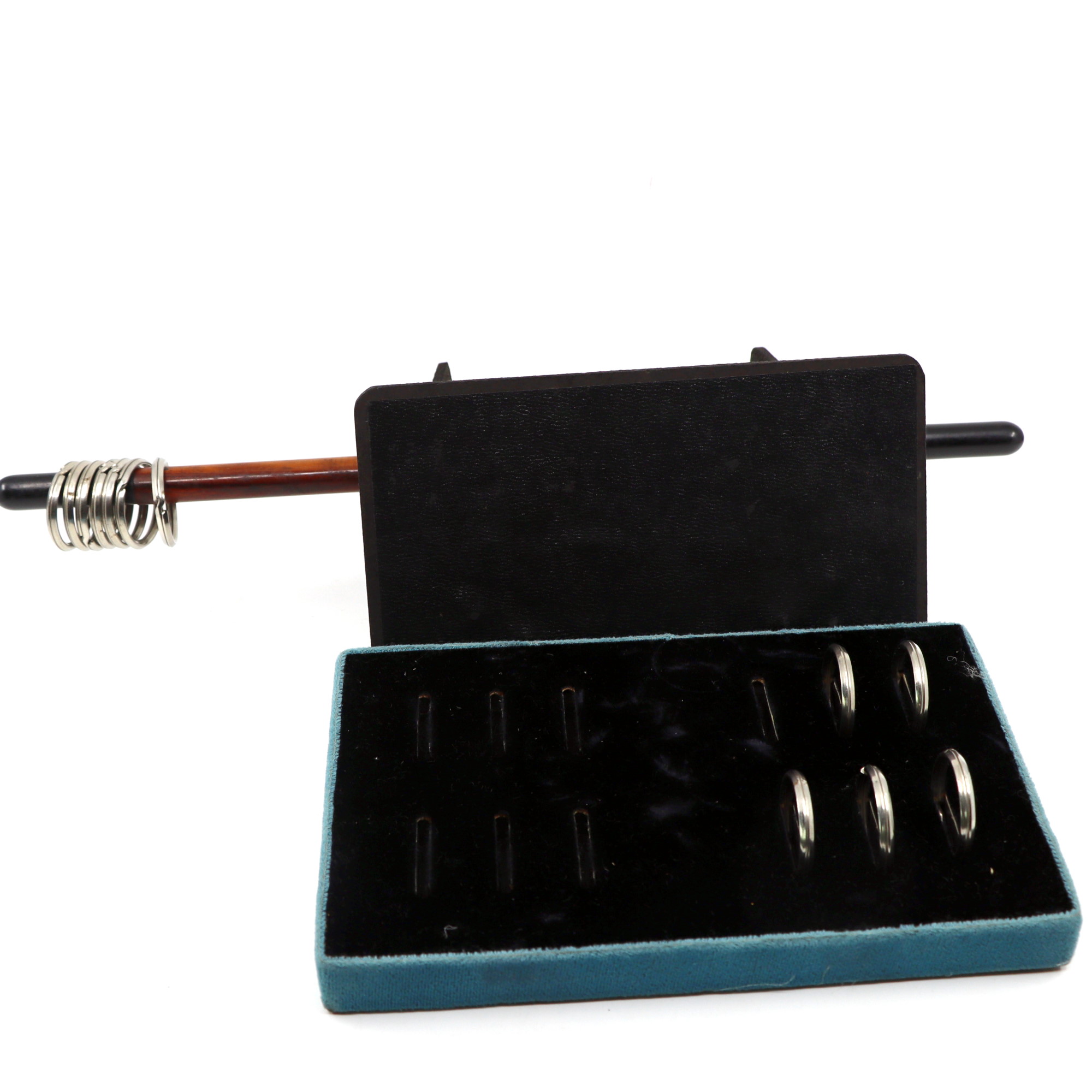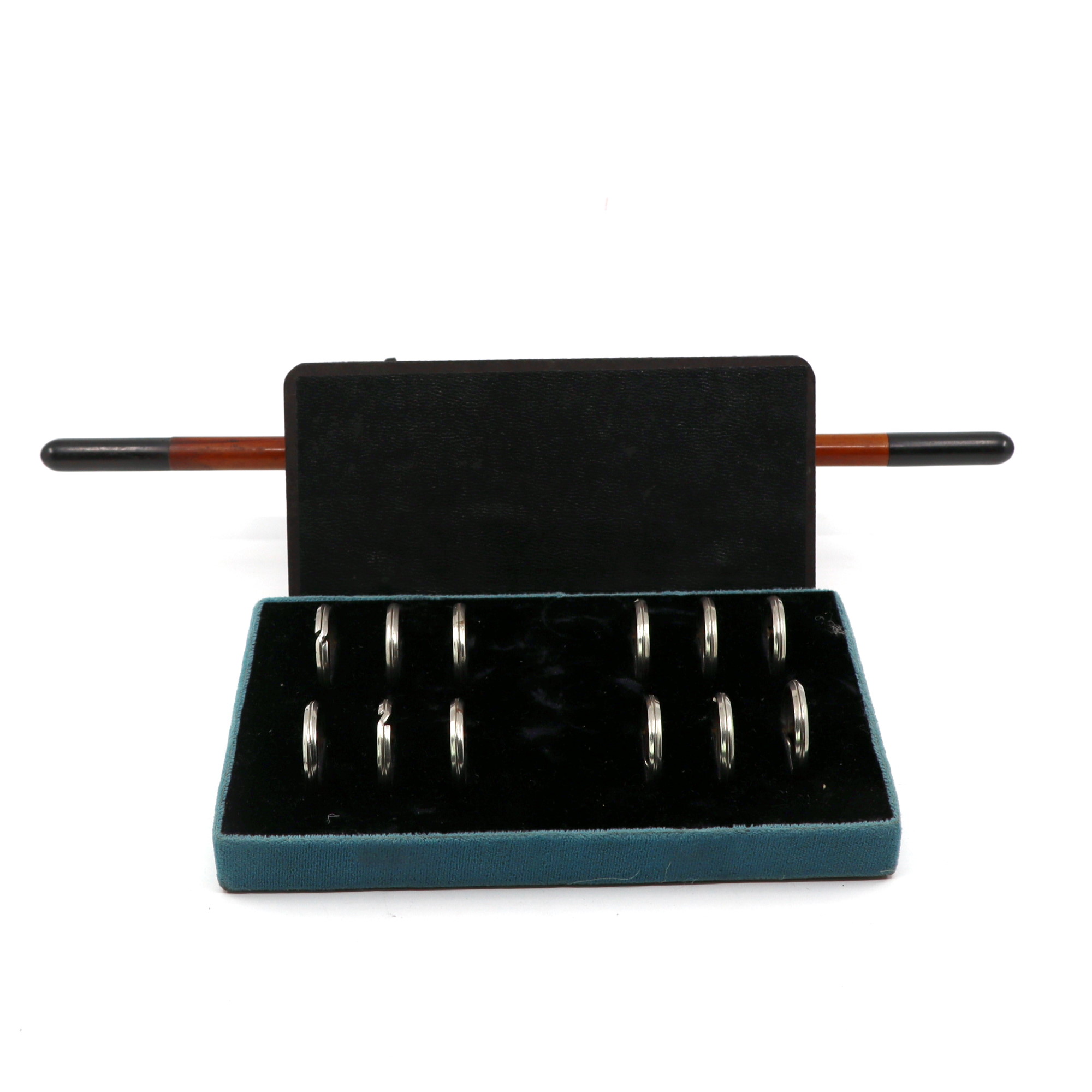 The magician removes twelve sparkling one inch key rings from o gorgeous velvet display case. These are picked up one at a time and dropped on a wand. Sliding the rings off into his hand the rings slowly emerge linked in ONE SOLID CHAIN and both hands shown empty.