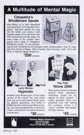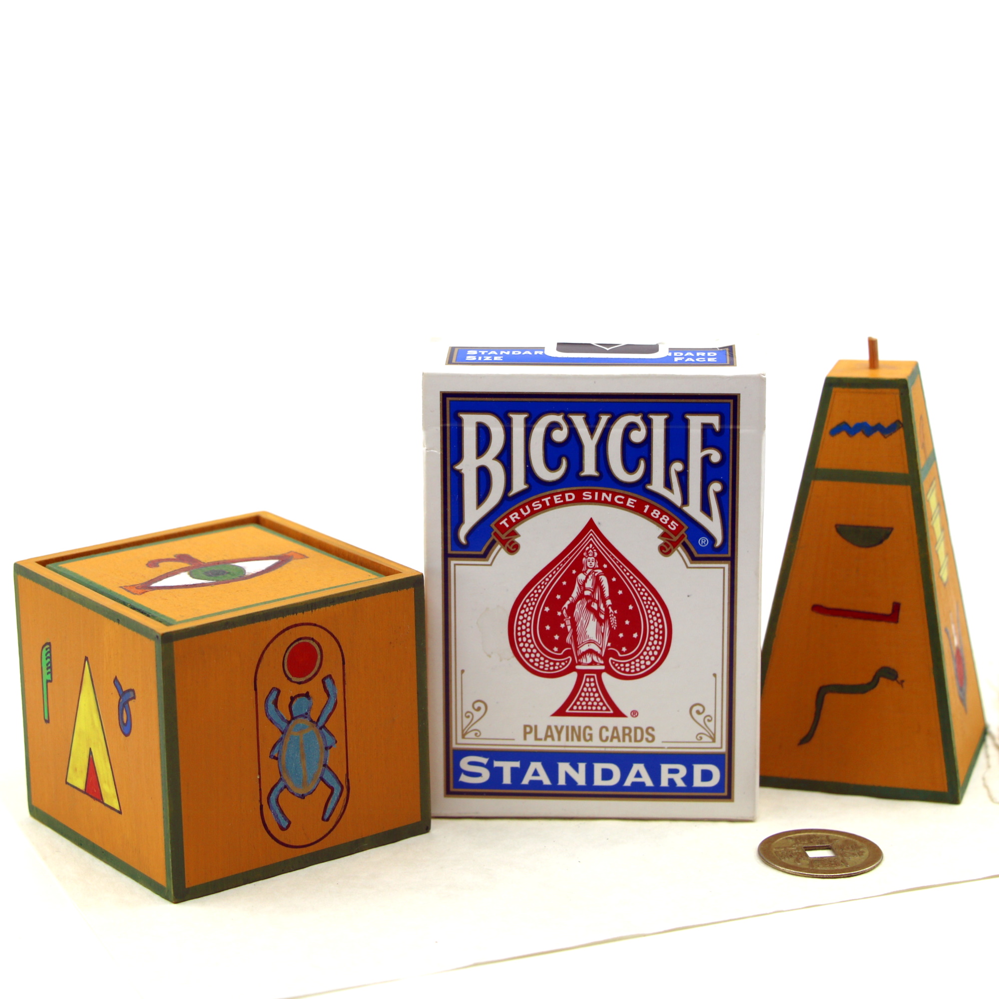 This beautiful piece was made out of wood and hand-painted by German craftsman Dietmar Willert c. 1987. Dietmar made a series of Egyptian themed pieces and all are beautiful and highly collectible. The Windblown sands was made in a limited edition of 87 units with each set numbered on the base – this is # 34 of 87. Joe Stevens marketed these c. 1989 and included an English patter story by Bill Palmer. The original version was actually created by Jan Gol and called Sand From The Windless Corner of The Sun Temple and described in the German Magic Magazine (March 1975).