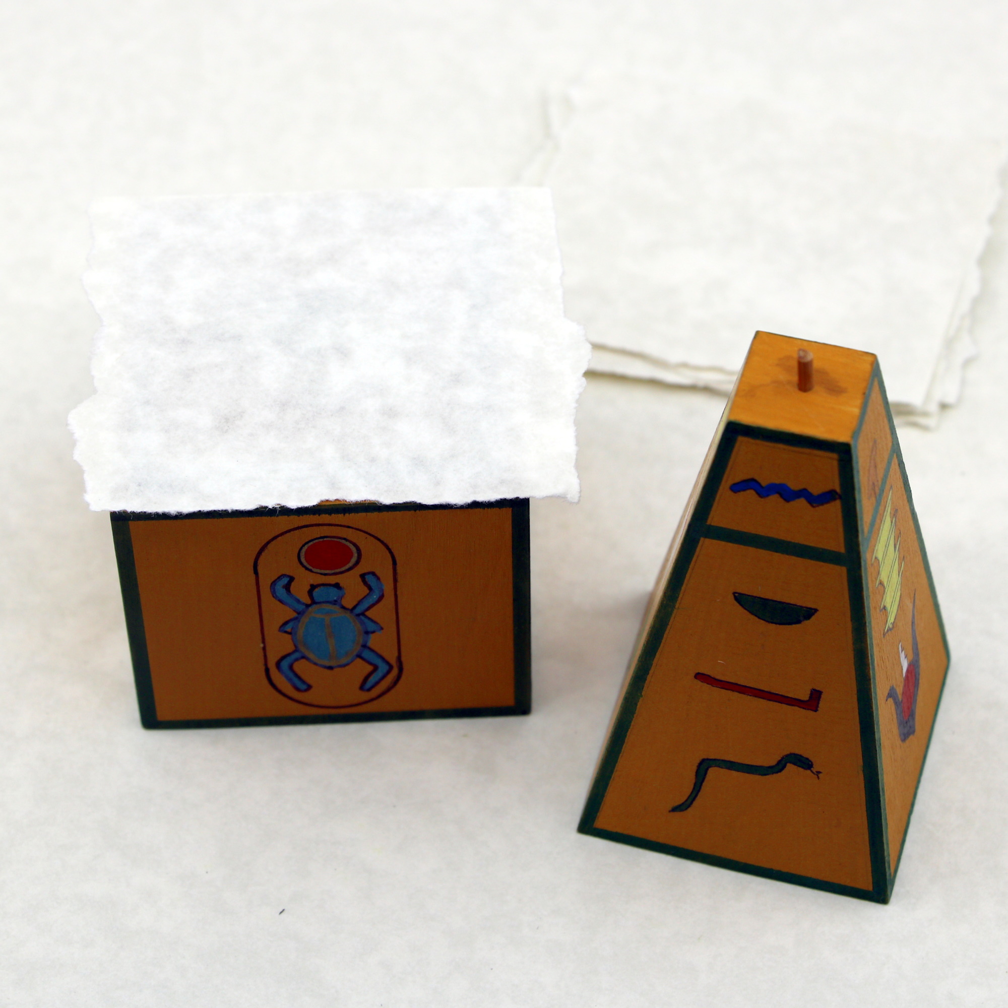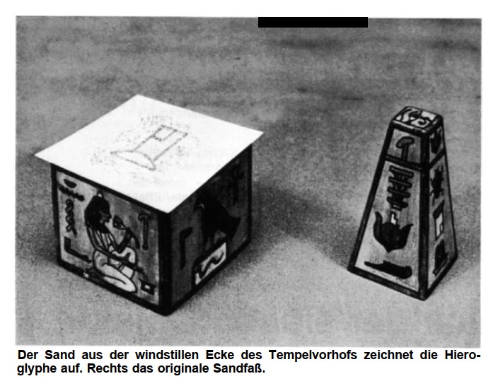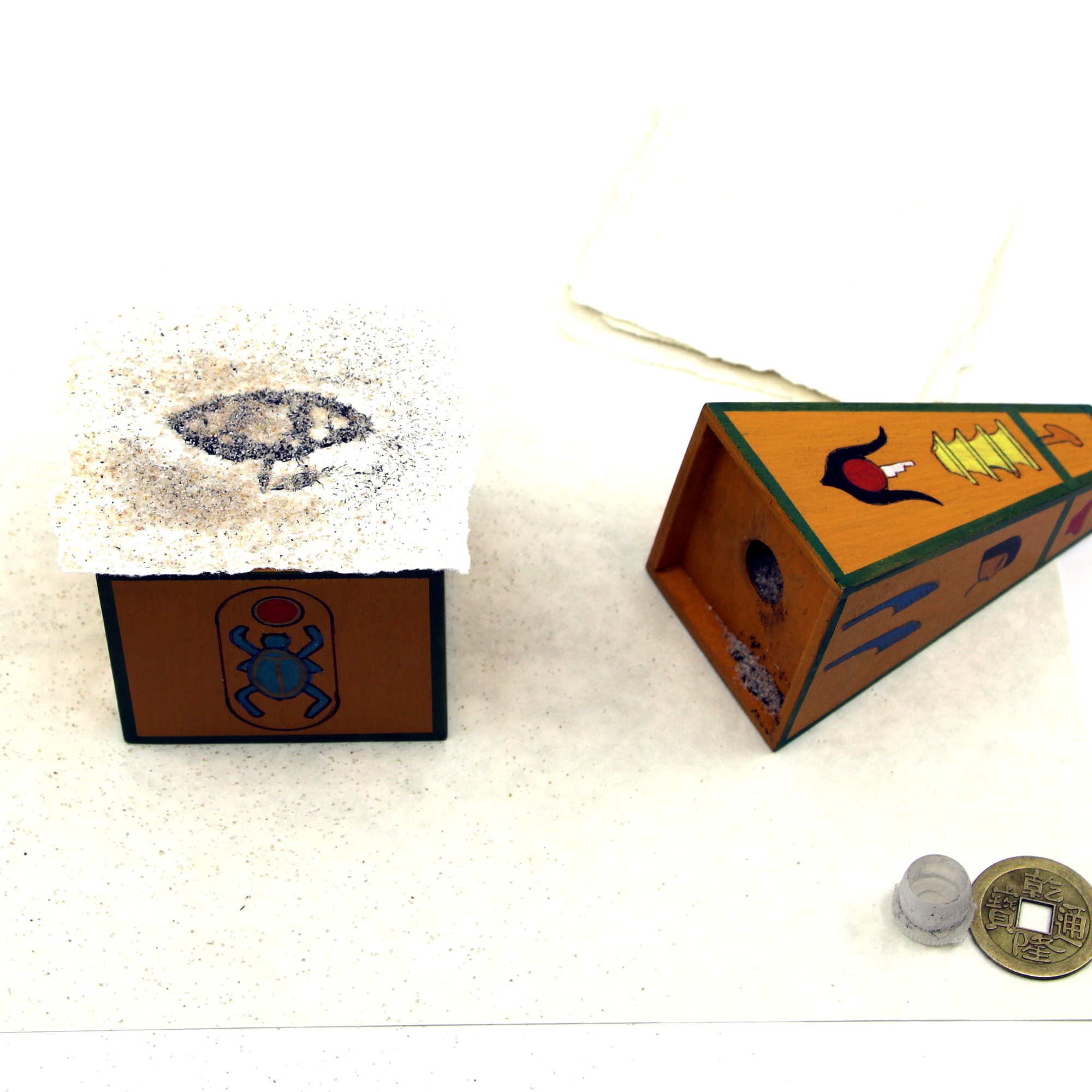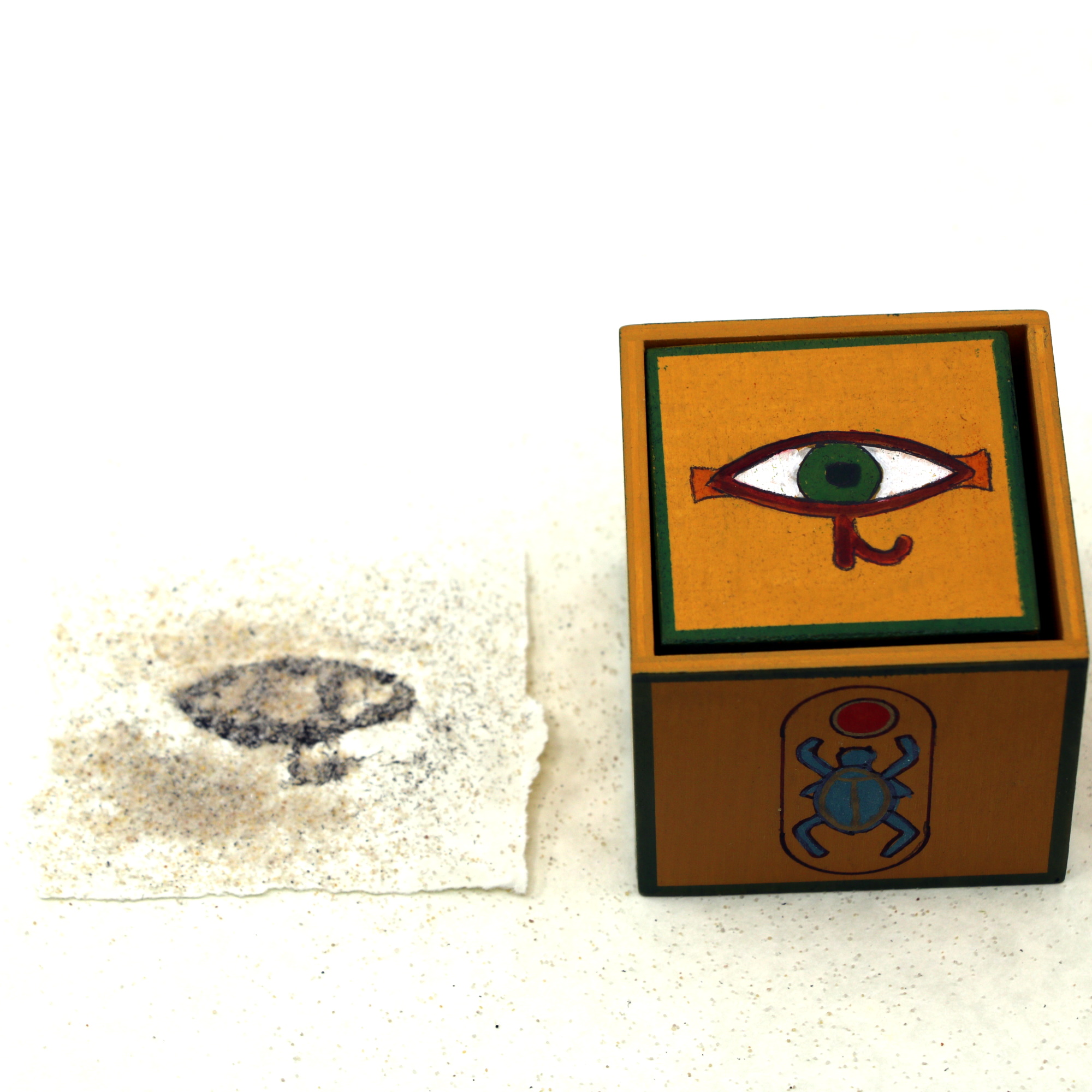Spectator places the cube into the holder and covers it with Egyptian paper. As he sprinkles sand from the pyramid onto the paper, the eerie shape of the chosen hieroglyphic forms visibly in Cleopatra’s Windblown Sands.