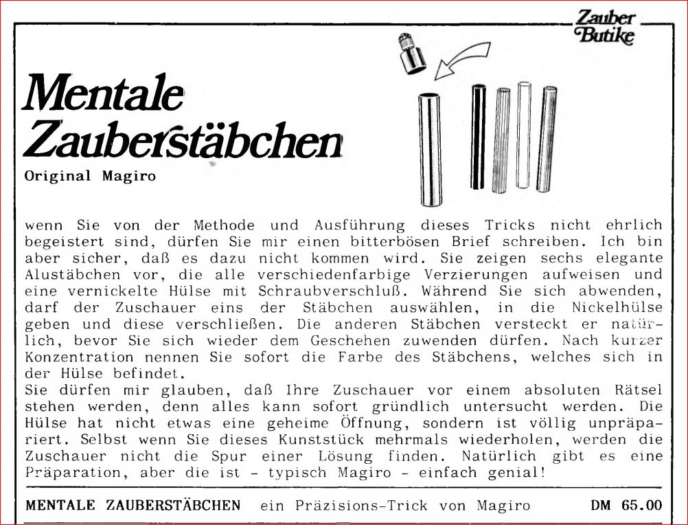 Here is another item offered through Howard Schwarzman’s Limited Editions Magic line created by Magiro. It was originally released by Eckhard Boettcher as Mentale Zauberstäbchen. It uses the same method that was used by Viking’s Trans-Mental c. 1988. However, I spoke to George Robinson and he has never seen Magiro’s version, instead he came up with the idea from an old Brema effect called Coin Divination. Viking’s version is certainly a more superior product, but they both work well.