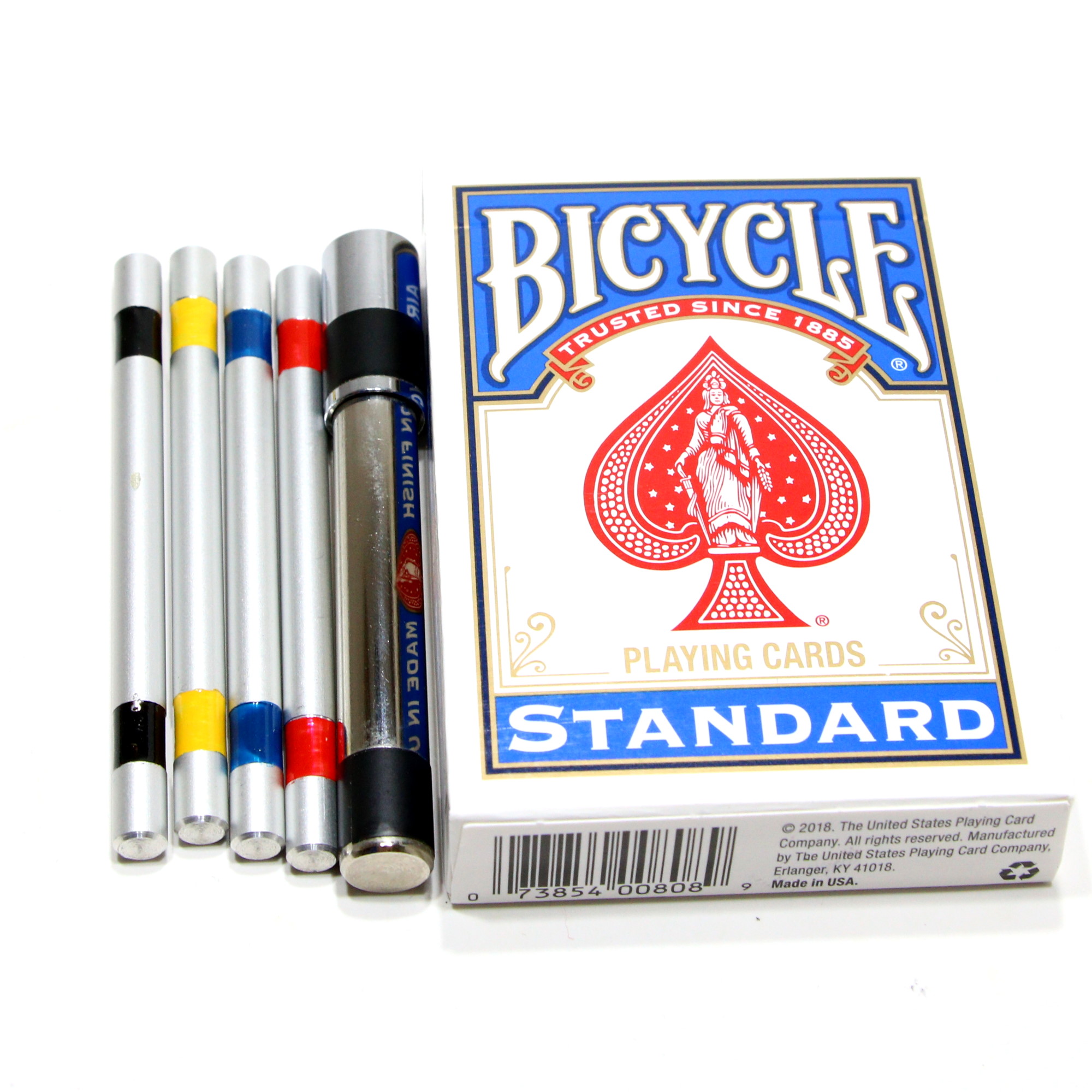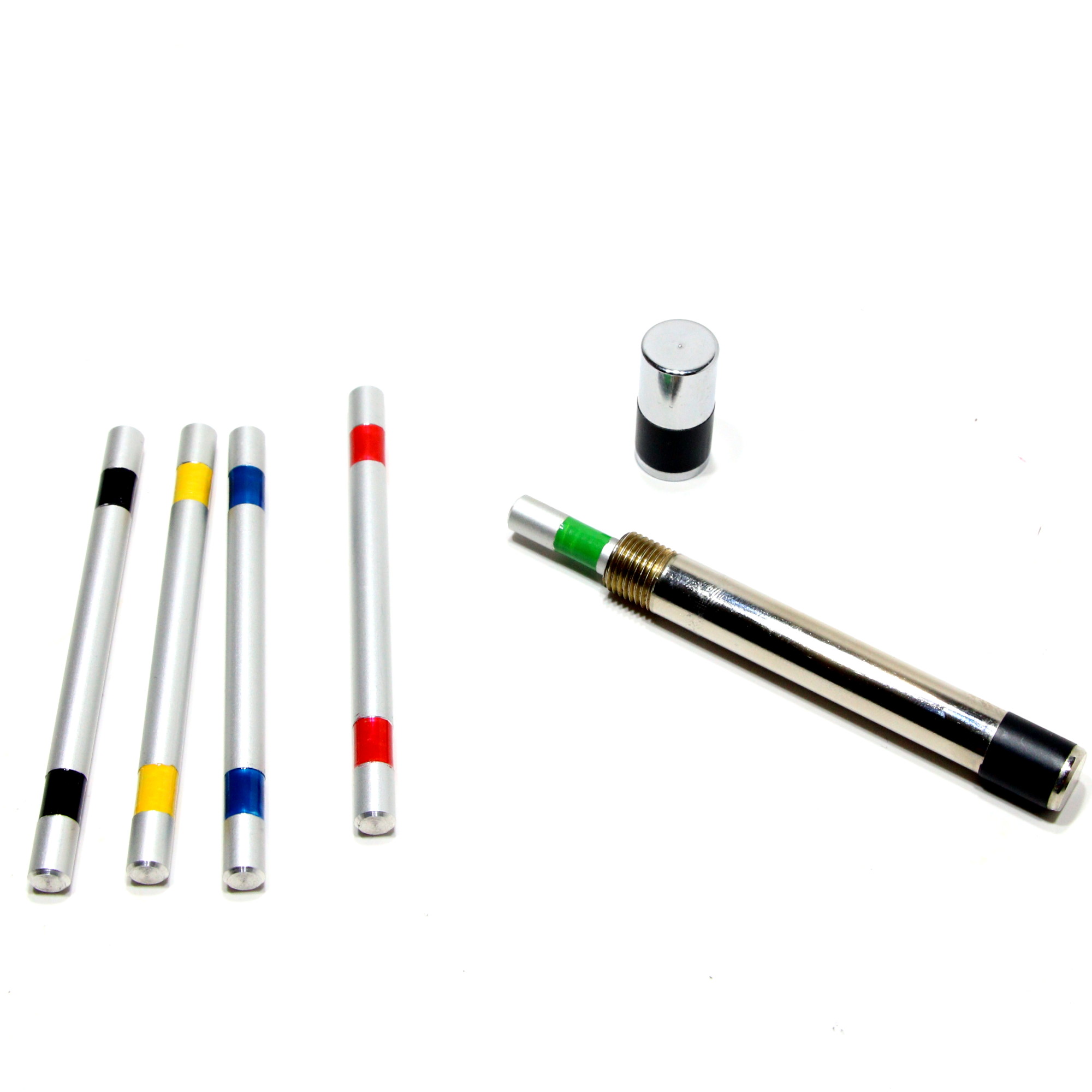 Effect: A spectator selects one of five different colored metal bars, puts it in a metal tube, screws on the cap, and conceals the remaining four bars. When the performer is handed the tube, he immediately knows the color of the bar inside and can reveal it in any manner he chooses.