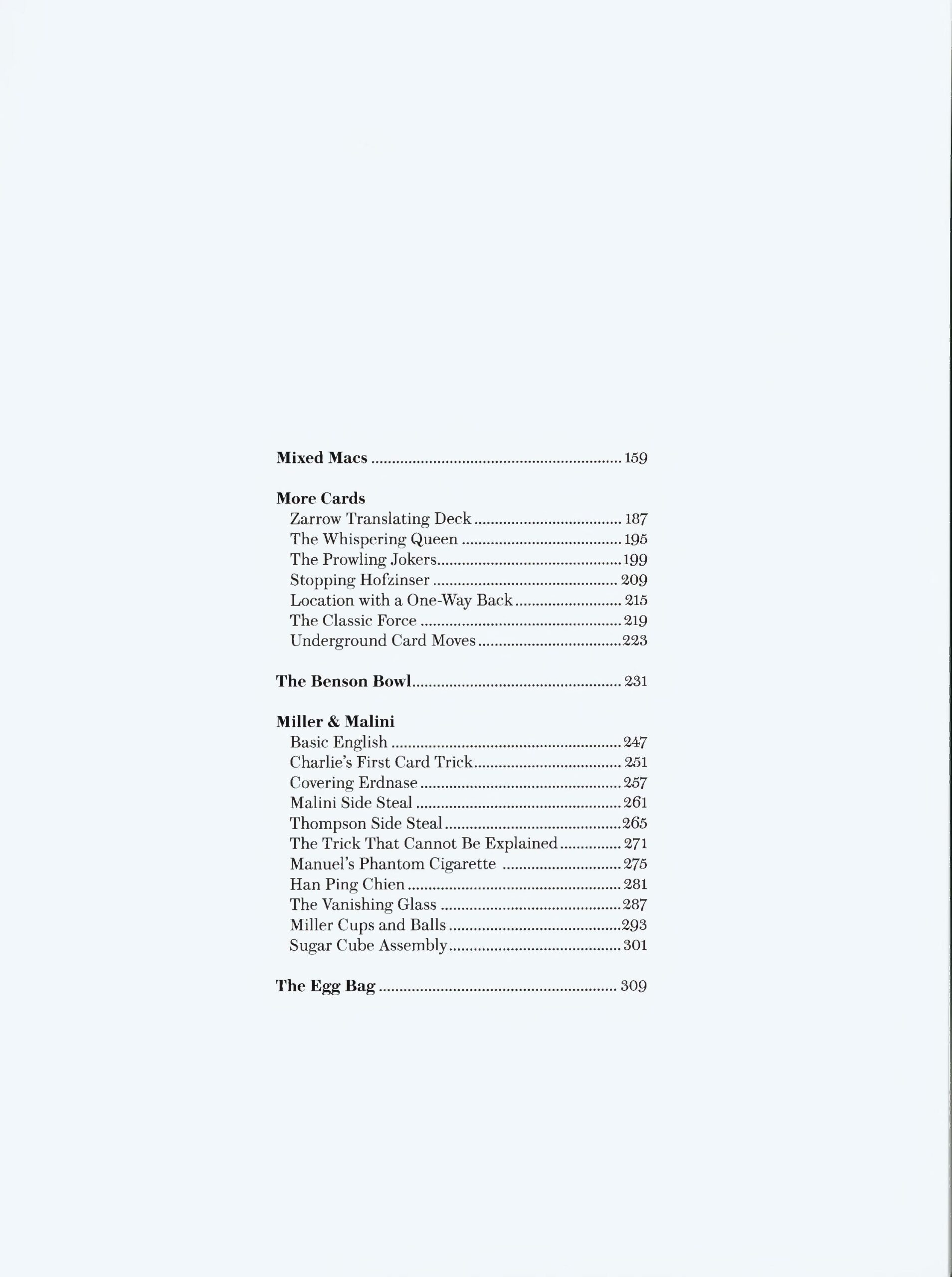- Miller & Malini | Basic English, Charlie’s First Card Trick, Covering Erdnase, Malini Side Steal, Thompson Side Steal, The Trick That Cannot Be Explained, Manuel’s Phantom Cigarette, Han Ping Chien, The Vanishing Glass, Miller Cups and Balls, Sugar Cube Assembly