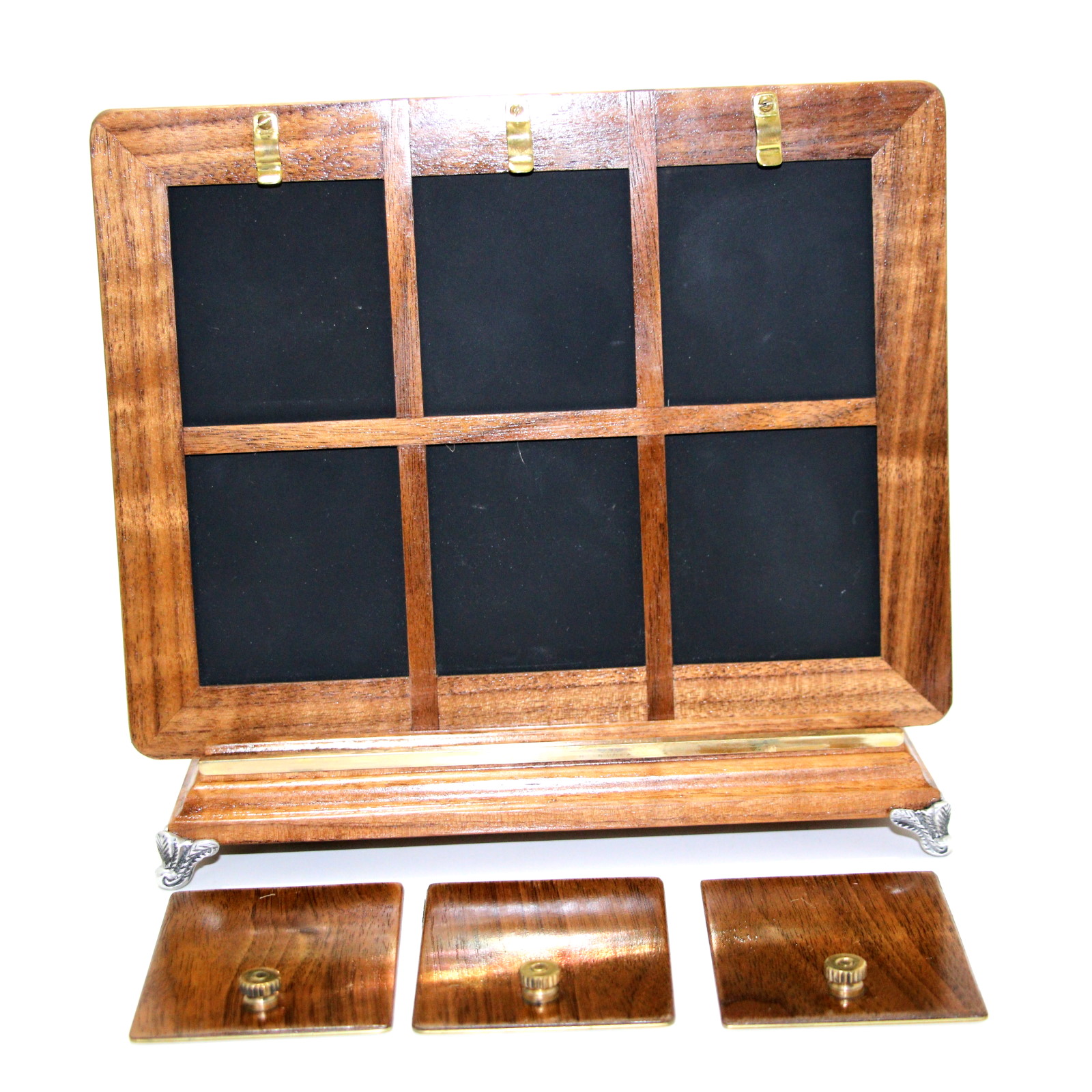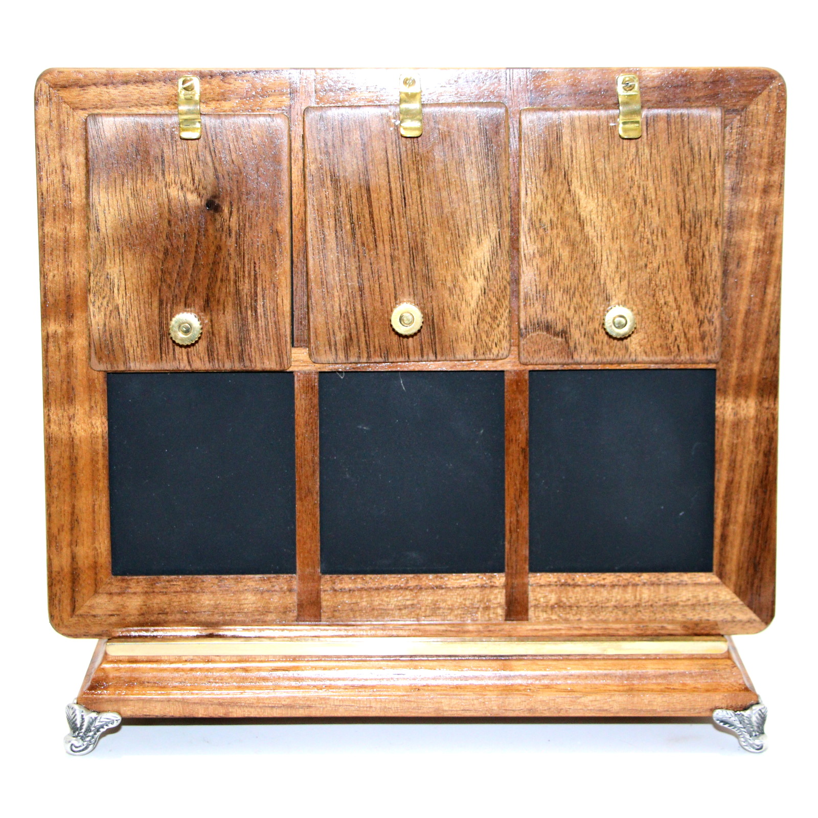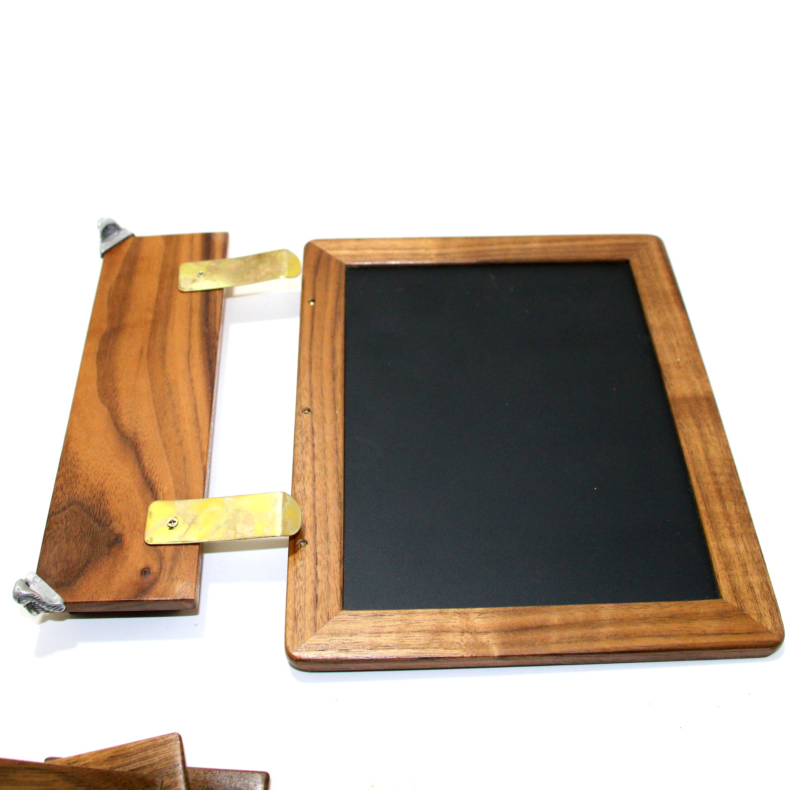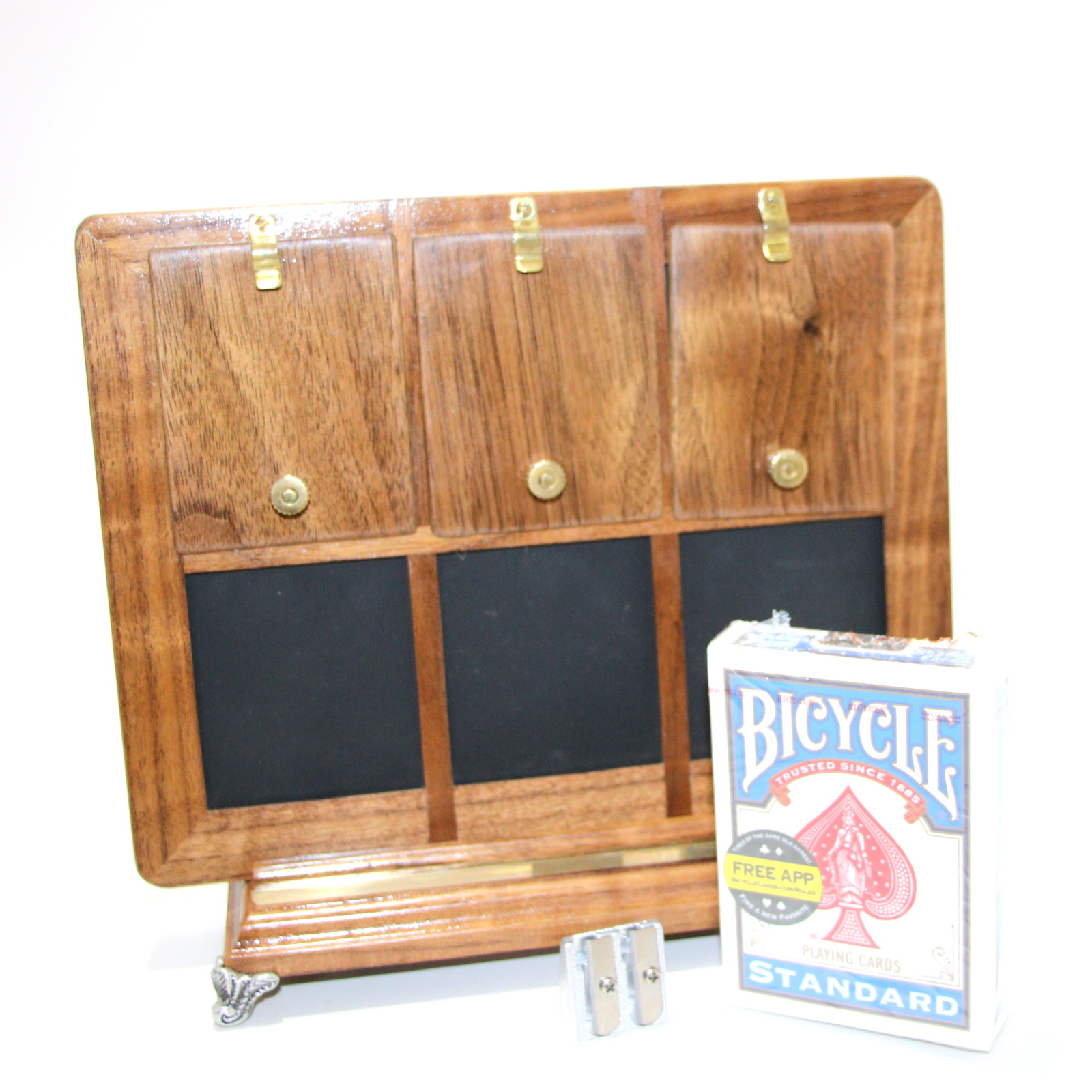 Chalkboard Measures 8½” x 6½”, complete with Victorian Display Stand, Burlap Bag, Box of Chalk and Chalk Sharpener Included. Custom made Brass Knobs, Covers & Clips. Special gaffed Bicycle Deck included.