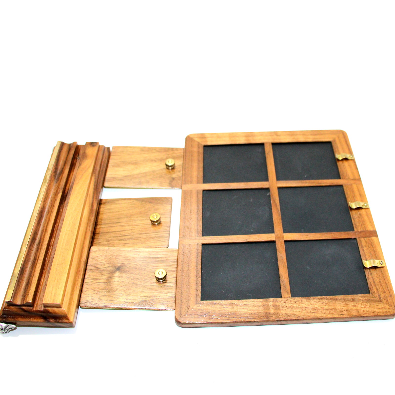 A small chalkboard, divided into six sections is shown sitting on an elegant stand which also rests a piece of chalk. The magician lifts it off the stand and writes a predication onto the first section and covers it with a small flap. He then asks an audience member to shout out any number. He then writes this number in the section below. Next, the magician writes another prediction in the top center section and again covers it. He now asks someone to name any color and writes it in bottom section. Last, magician writes a playing card in final top section and covers it. He then riffles through a deck of cards and asks the spectator to remember one. The name of that card is written in the final square.