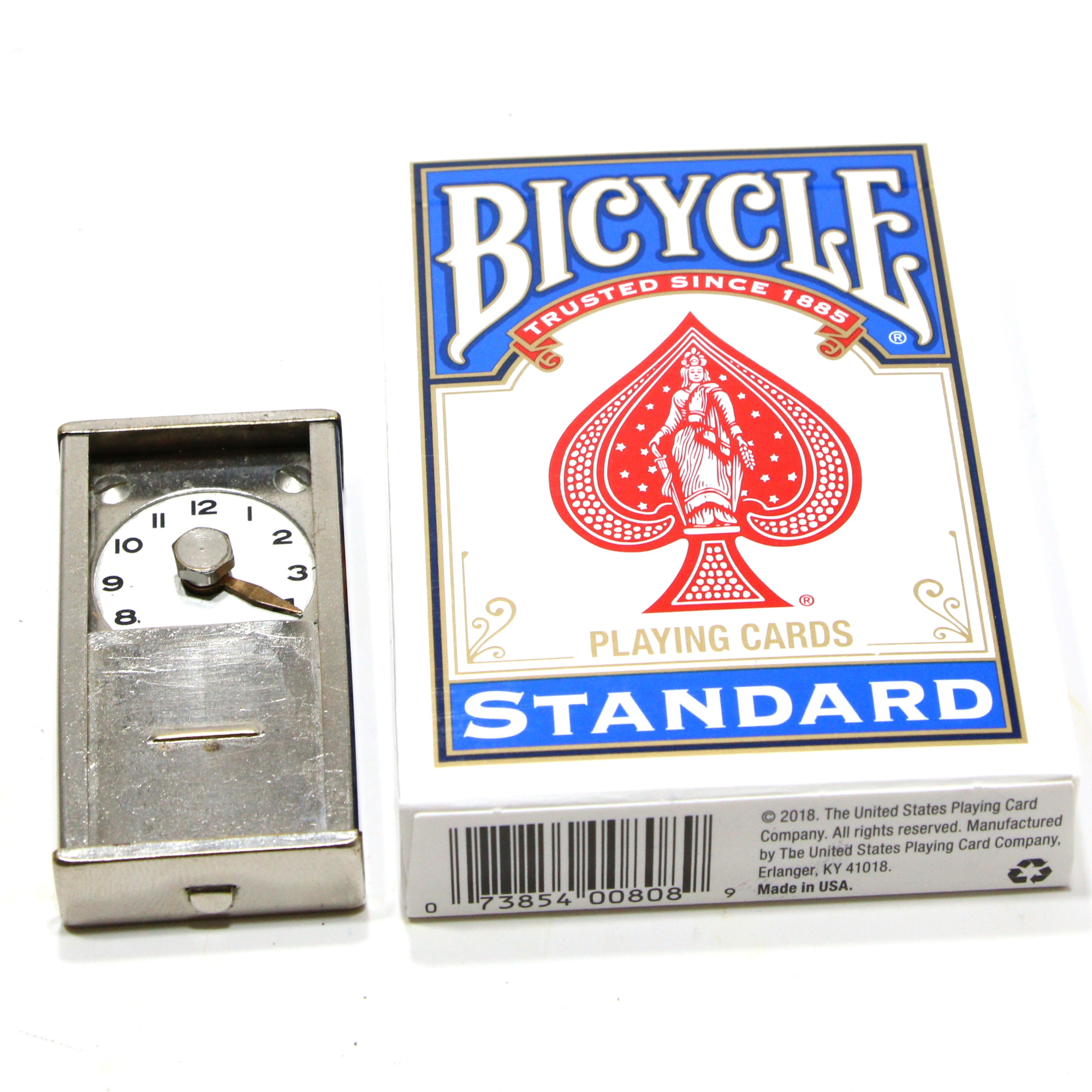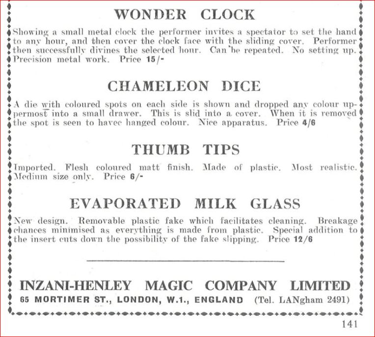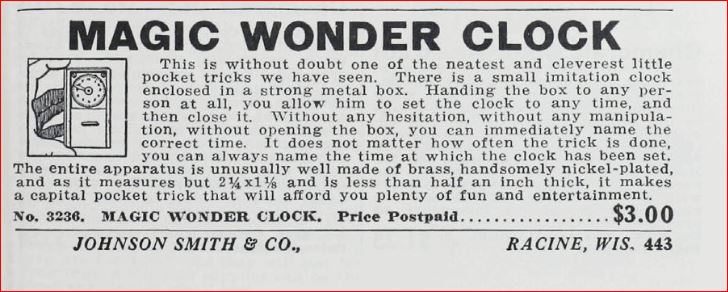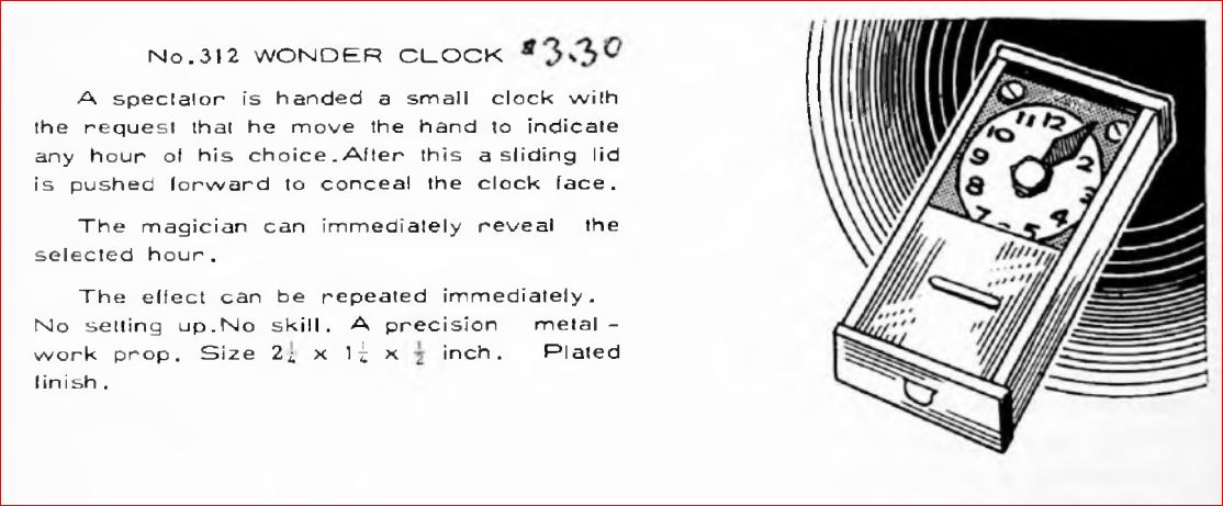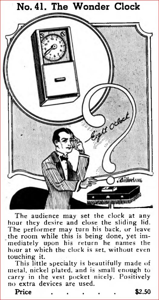 Effect: The audience may set the clock at any hour they desire and close the sliding lid. The performer may turn his back, or leave the room while this is being done, yet immediately upon his return he names the hour at which the clock is set, without even touching it.